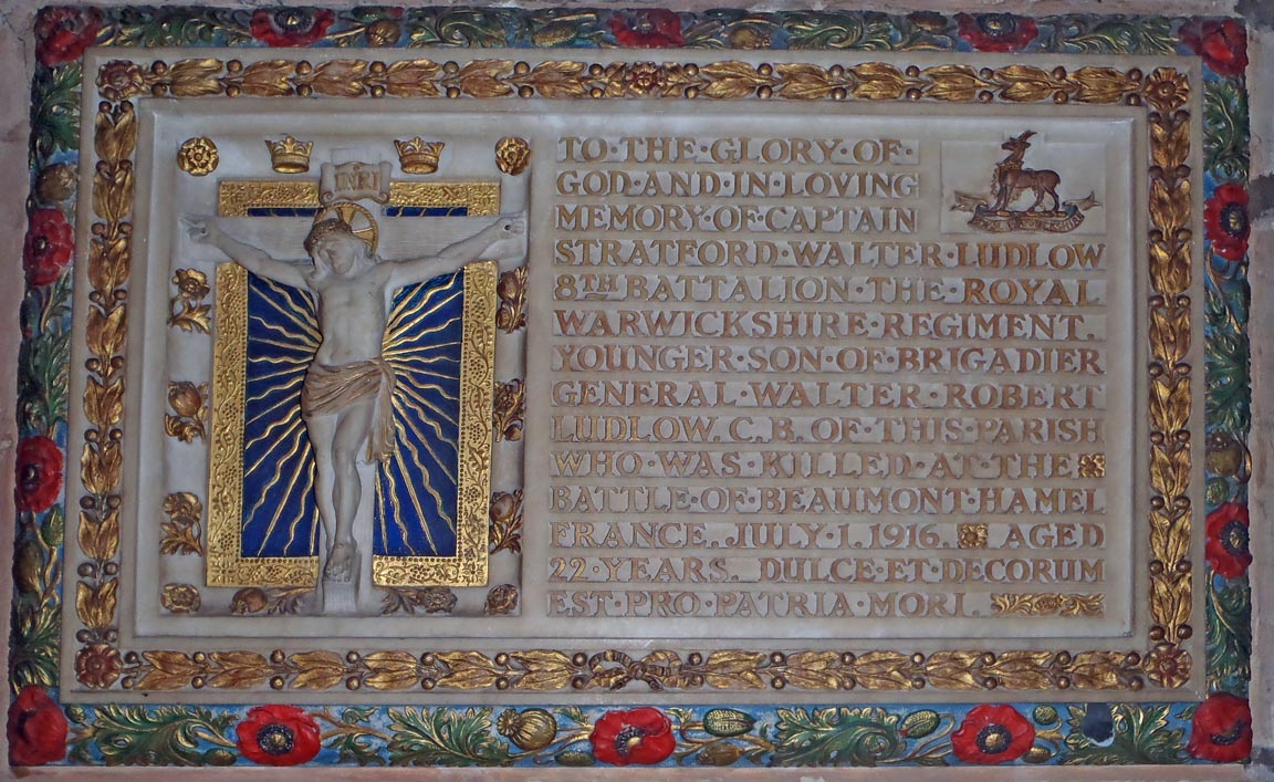 Stratford Ludlow is buried at Serre Road Cemetery No. 2, France, and is also commemorated locally on war memorials at Dorridge, Knowle and Solihull. His name also appears on his school’s Roll of Honour, and his is commemorated on the King’s School window at Worcester Cathedral
