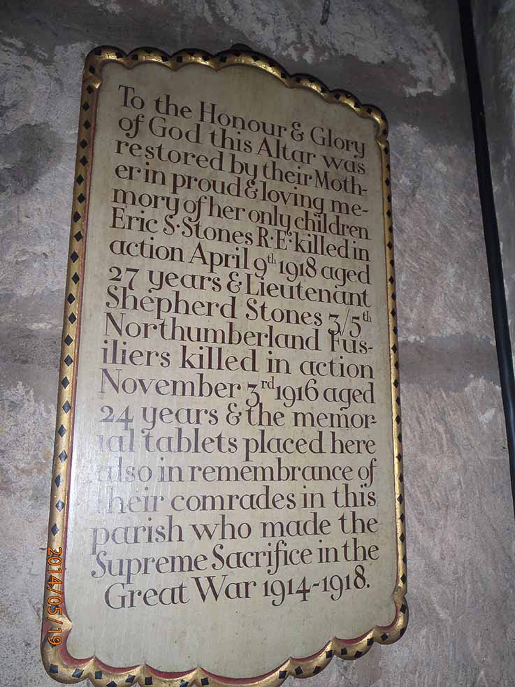 He is buried at Bazentin-le-Petit Communal Cemetery Extension and commemorated on a Special Memorial there. He is also commemorated on his father’s gravestone in Brooklands Cemetery, Sale and is included in the North East War Memorials Project. Locally, his name is included on the Solihull war memorial and his mother, Elizabeth, also paid for the restoration of the altar in St Antony’s Chapel, St Alphege Church, Solihull, in remembrance of her only children, Eric and Shepherd Stones.
