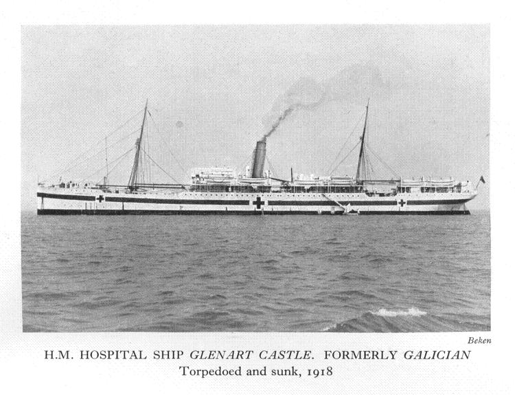 The Dover Castle was sunk by torpedo on 26th May 1917 but Matron Beaufoy was not aboard, having been invalided home on 7th May with inflamed haemorrhoids which were attributed to the poor conditions in Salonika. After recovering from her operation and being declared fit for duty on 13th September, she joined the Glenart Castle as Matron on 13th November 1917.