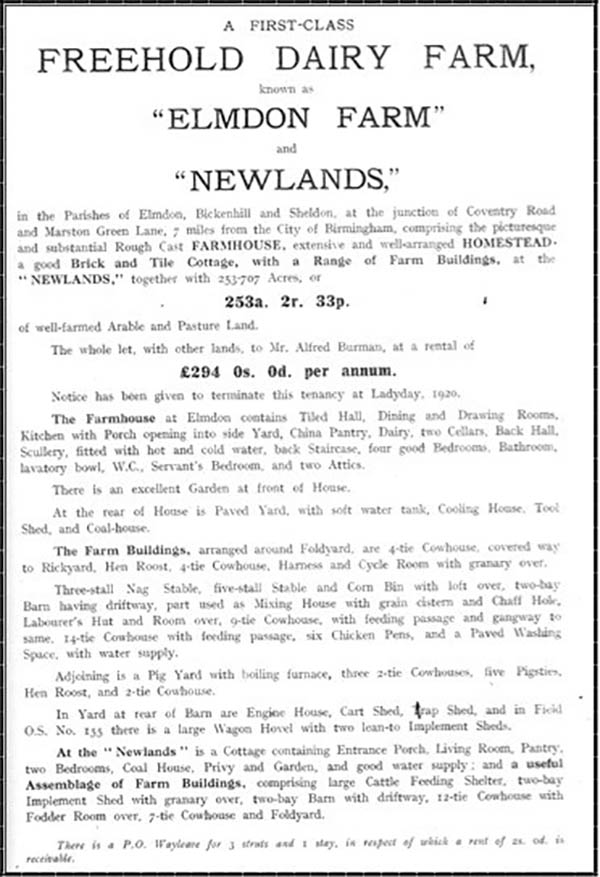 The family had also farmed Newlands Farm which was located on land which is now Birmingham International Airport. Newlands Farm had been sold on the instruction of Major Major F. J. B. Wingfield Digby (1885-1952) as part of the sale of the outlying portions of the Coleshill Estate in July 1919. It’s likely to be at that time that the Mellish family bought the farm. The sale catalogue, pictured below, described Newlands as consisting of a two-bedroomed cottage and “an assemblage of useful farm buildings.”