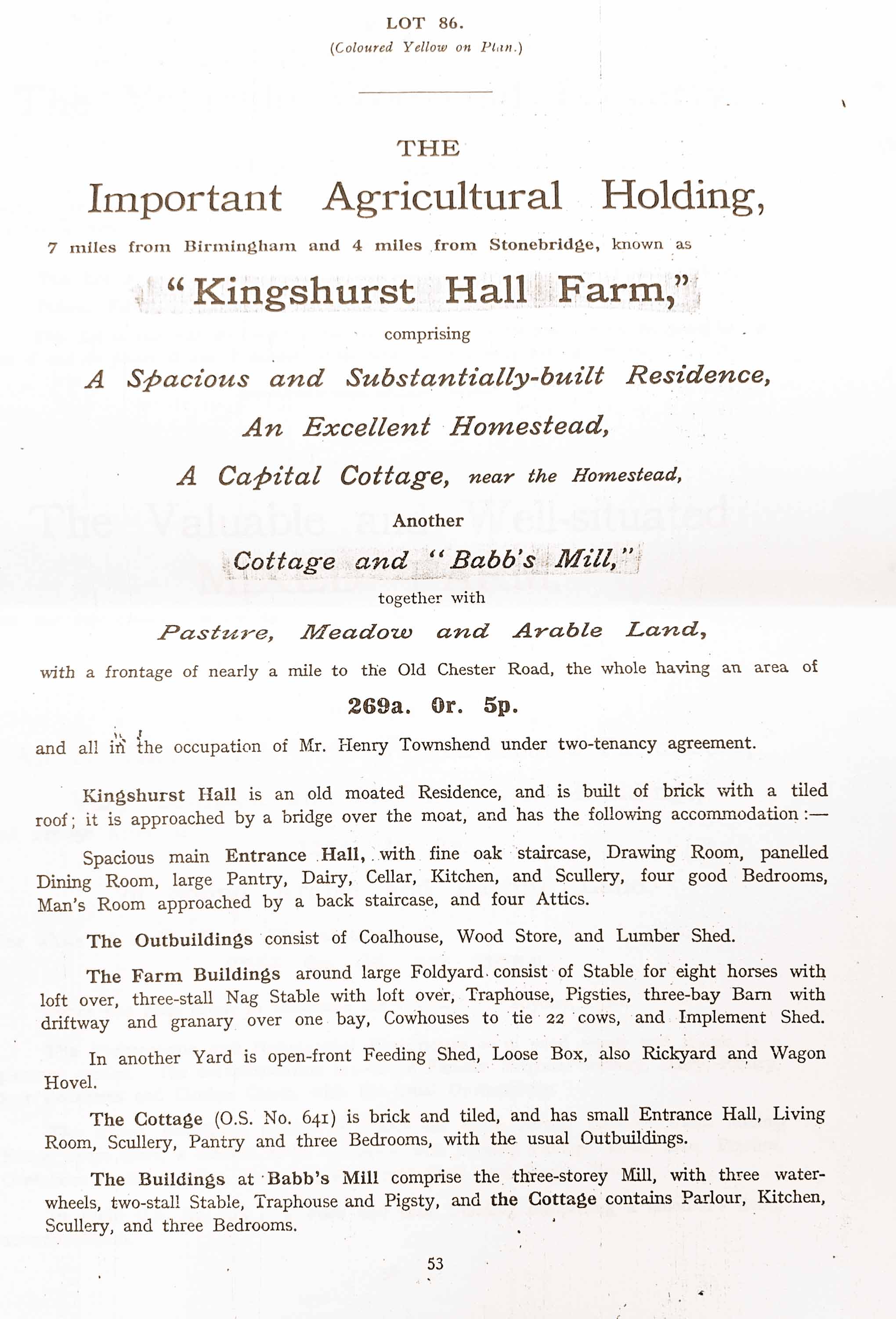 However, an obituary of Walter John Townshend in 1961 said that it was his father, Henry Townshend, who purchased the hall in July 1919 from the estate of Major F. J. B. Wingfield Digby. The article says that Henry Townshend purchased Kingshurst Hall Farm, comprising 269 acres, and Cocksparrow Farm, of 143 acres.