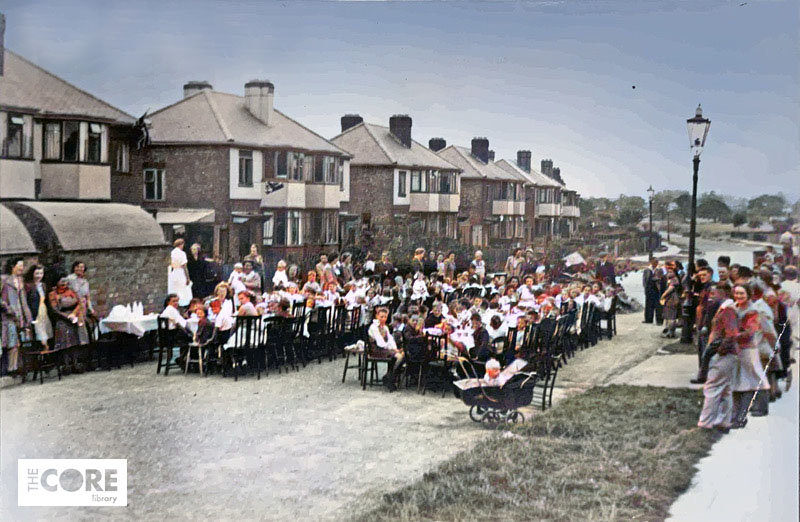 Alston Road, Elmdon Heath celebrated with a bonfire in the field behind the houses, as well as a display of fireworks and free refreshments for everyone, including chips as an extra treat for the children. A loudspeaker van provided music for dancing and the whole area was floodlit. A Maypole was specially erected for the occasion, which the children enjoyed dancing around. The night ended with community singing round the fire, to the accompaniment of two accordions. Poignantly, the area had been hit by a bomb around 6am on 27th July 1942 and four people from Alston Road, as well as a family of six from nearby Cornyx Lane, were killed.