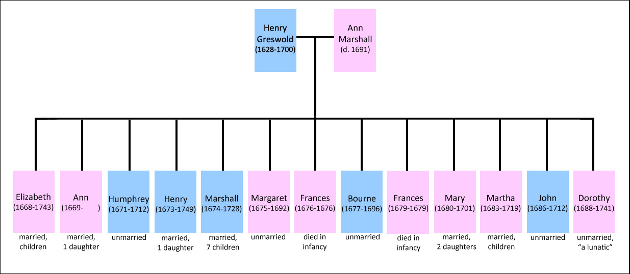 Henry Greswold married Ann Marshall in 1667 and they had 13 children (eight daughters and five sons).
