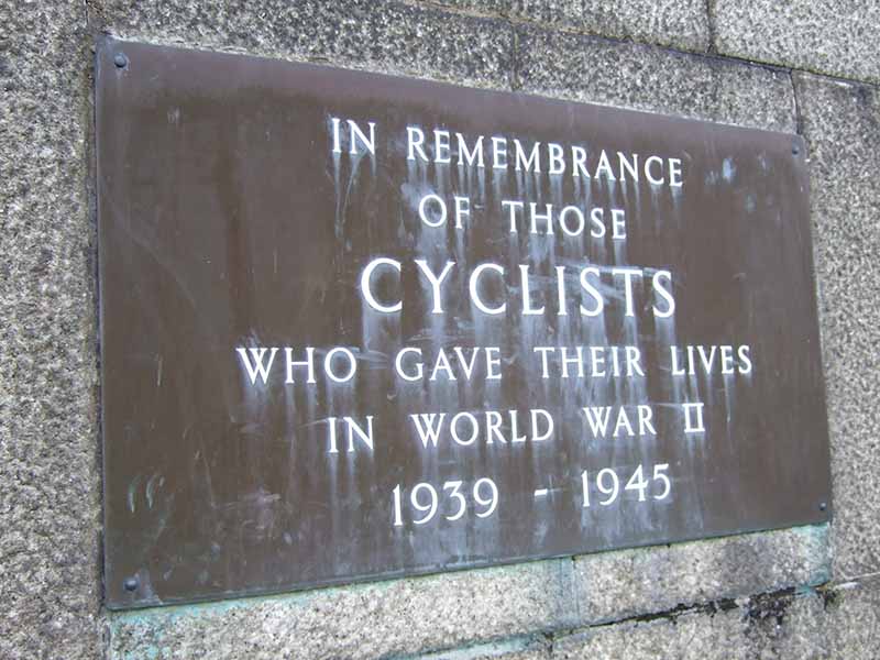 On 19th May 1963, a memorial plaque was added in memory of those cyclists who died during the Second World War. Expert advice was to add a bronze panel in preference to inserting a stone panel as there were concerns that inscribing in the stone would damage the granite surface or cause instability to the monument.