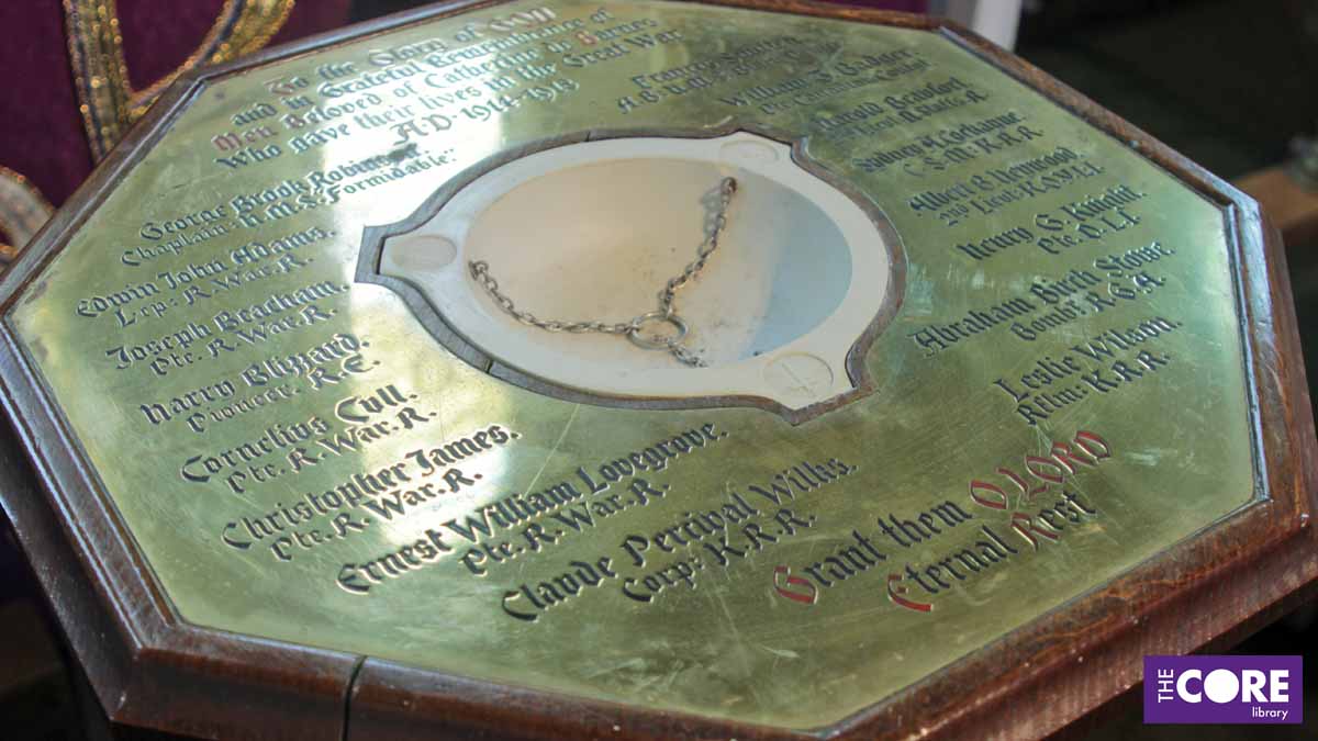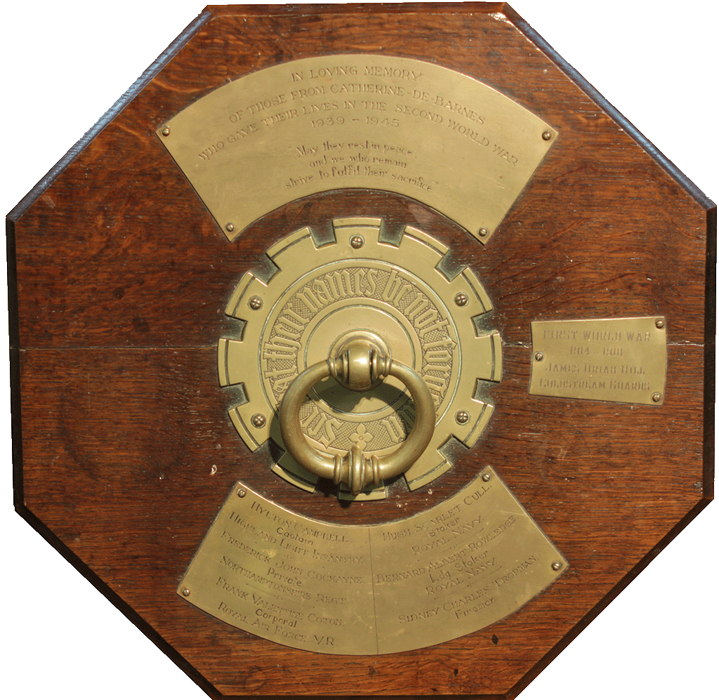 The cover also includes a plaque to a First World War casualty, whose connection to Catherine-de-Barnes we haven’t been able to find out: