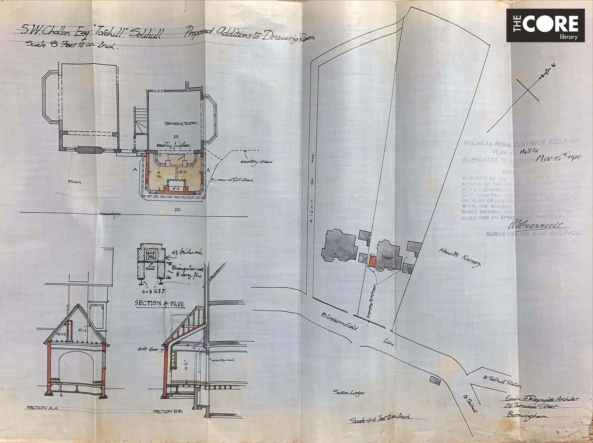 A plan was submitted in 1910 for an extension to the drawing room at Totehill, designed by Edwin F. Reynolds, architect.