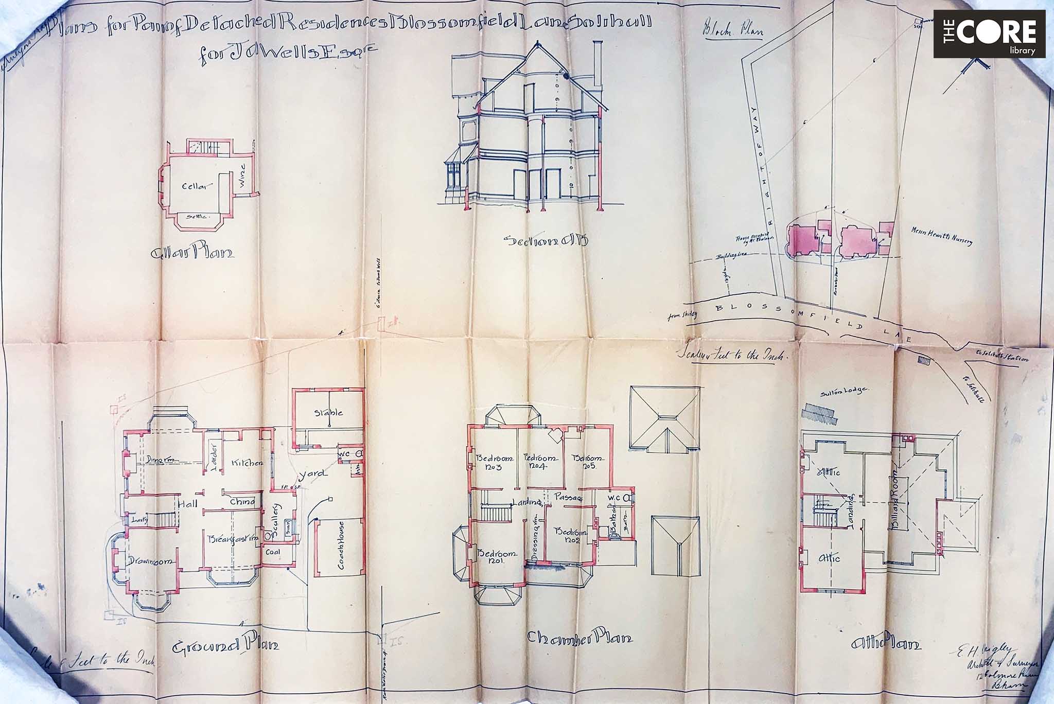 A building plan (ref.: SOL/PS/1/2/423) was submitted to Solihull Council in April 1901 for the building of two detached houses in Blossomfield Road, owned by J. Wells. Although the houses were not named on the application, the block plan matches that of a later plan and would seem to indicate that the houses were Armadale (on the left) and Totehill (on the right).