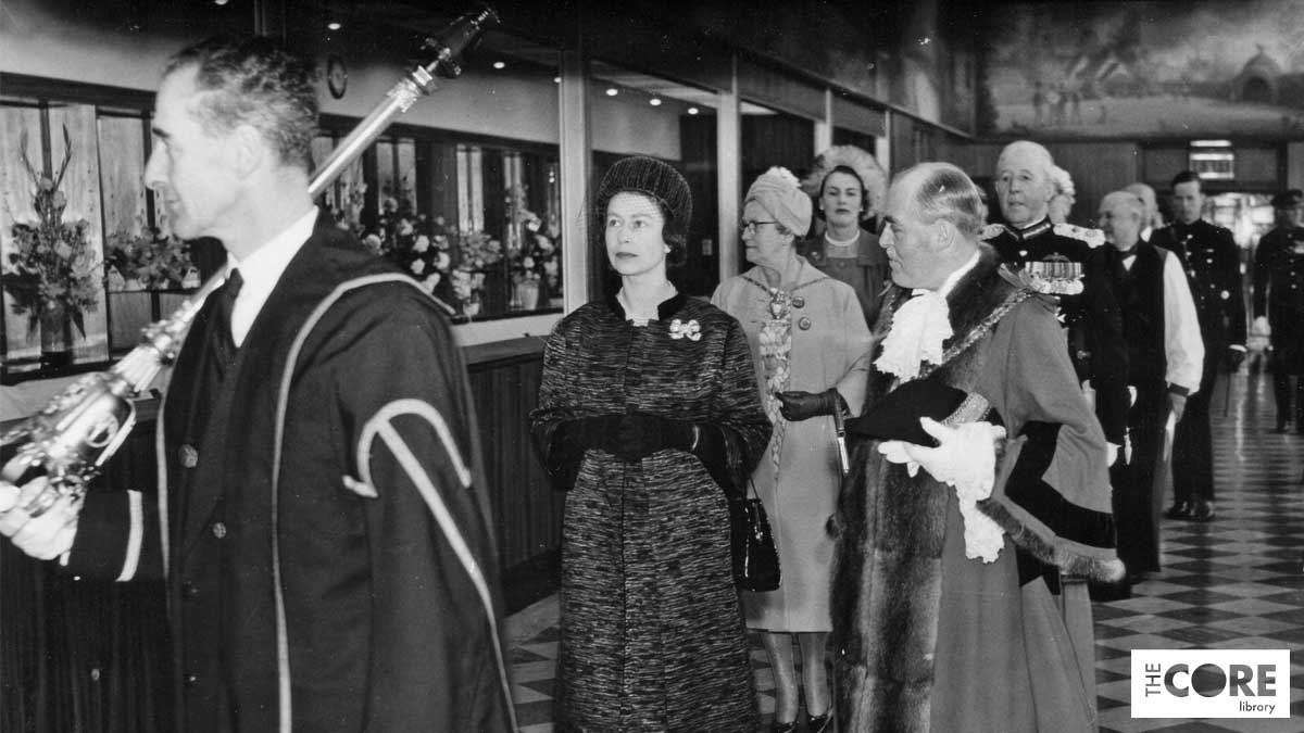 The architect of the building, Mr Ernest Berry Webber (1896-1963), presented the Queen with a silver-gilt key, surmounted by the borough’s coat of arms, with which she opened the main doors. The official party then proceeded to the main floor. The band of the 1st Battalion, Royal Warwickshire Regiment played as the guests assembled.