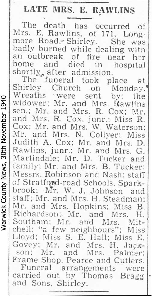 - Edith Ellen Rawlins, aged 38, was injured on 19th November 1940, at 171 Longmore Road, Shirley and died at Solihull Hospital on 20th November 1940. A report of her death and funeral in the Warwick County News of 30th November 1940 (see image below) makes no mention of her dying as a result of enemy action, instead saying that she was badly burned whilst dealing with an outbreak of fire near her home. It seems likely that an incendiary bomb caused this outbreak of fire.