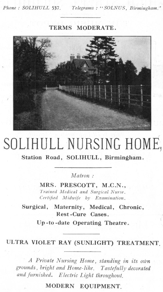 By 1928, Northmede had become a private nursing home offering maternity and medical services under the management of Mrs Prescott, a trained medical and surgical nurse, as well as a certified midwife. A litter of Sealyham puppies was offered for sale in July 1928, by application to “Prescott, Northmede, Station Road, Solihull.” (Sheffield Independent, Saturday 28th July 1928).