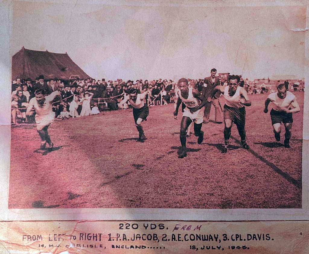 A photograph shows Jake (centre) running a 220 yards race in July 1945, whilst stationed at Carlisle.