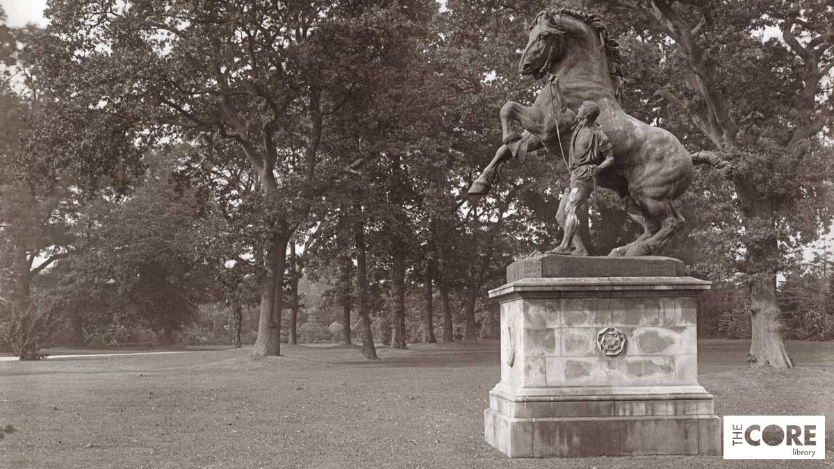 Historic newspaper articles also refer to the sculpture as “The Prancing Horse and Man.”