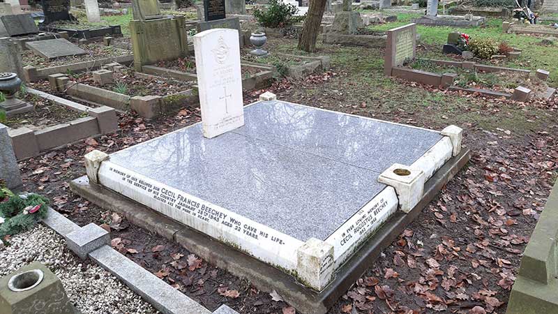 Probate records simply state that Cecil Francis Beechey died on 28th January 1943 whilst on war service. In fact, he was killed when his Typhoon aeroplane suffered a structural failure whilst he pulled out of a dive. Apparently, a design fault meant that there was a weakness in the connection of the main fuselage to the tail unit. When the aircraft was subject to severe stresses, there was a tendency for the tail to sheer off.