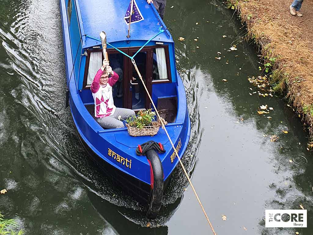 After leaving Marston Green, the baton travelled by narrowboat along the Grand Union Canal, with the boat “Shanti” being pulled by shire horse, Ebony. The baton was carried by BB060, Aaron Ciesar, as the boat travelled from Damson Parkway to Solihull Canoe Club.