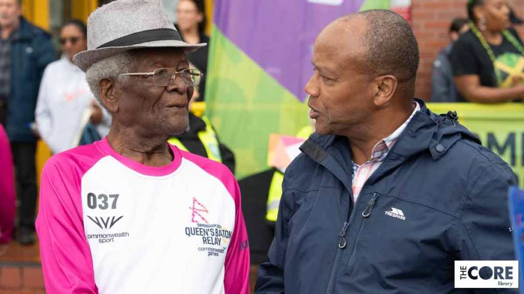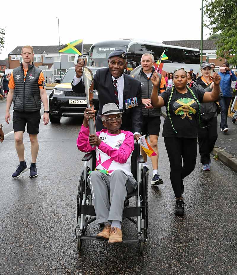 Around 20 minutes later than its scheduled arrival time of 9:52am, the baton entered North Solihull Sports Centre car park carried by Second World War RAF veteran, Albert Jarrett (BB037), aged 98. The second-oldest of the 2,000 people who carried the Queen’s baton across England, he was pushed in his wheelchair by his friend, former Warrant Officer Donald Campbell. They were accompanied by a song written in honour of Mr Jarrett by Birmingham reggae artist Ras Negus. Supporters came from as far away as Manchester and Buckinghamshire to watch Mr Jarrett carry the baton.