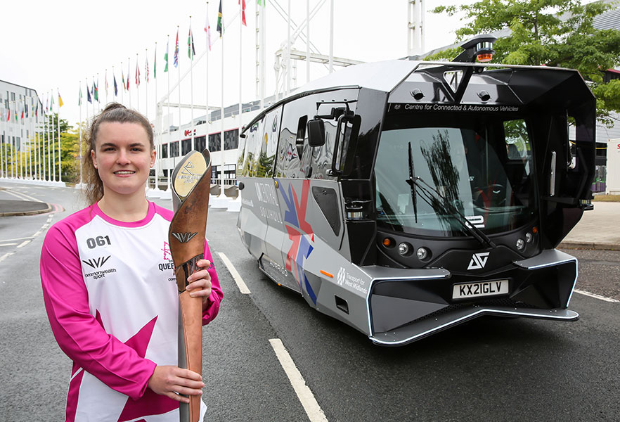 After its trip by narrowboat, the baton travelled from Catherine-de-Barnes by vehicle to the National Exhibition Centre, where it was carried by BB061, Heidi Rhodes James, and taken on board an autonomous vehicle. The self-driving bus took the baton and QBR crew from the corner of Resorts World to the main entrance of the NEC.