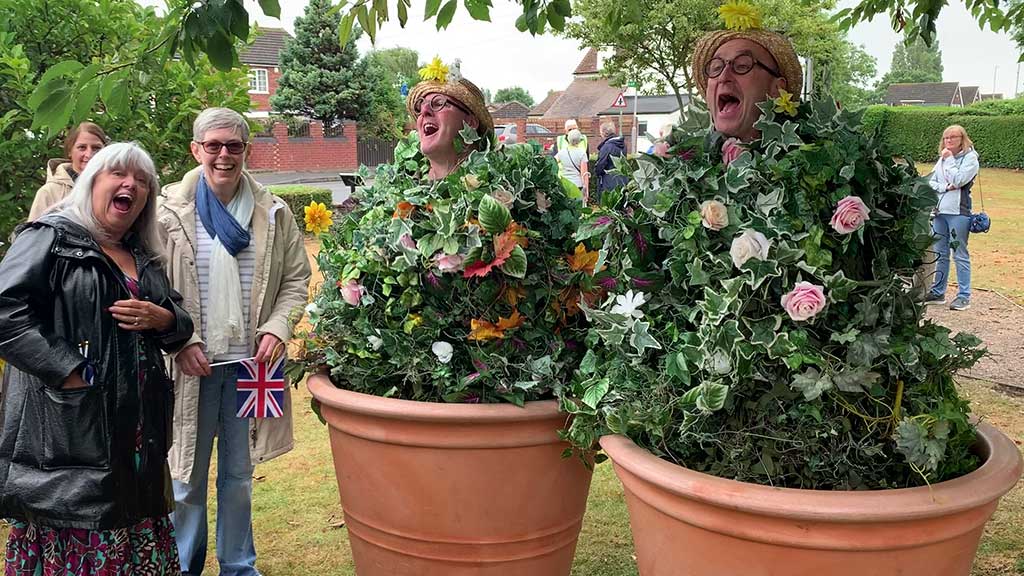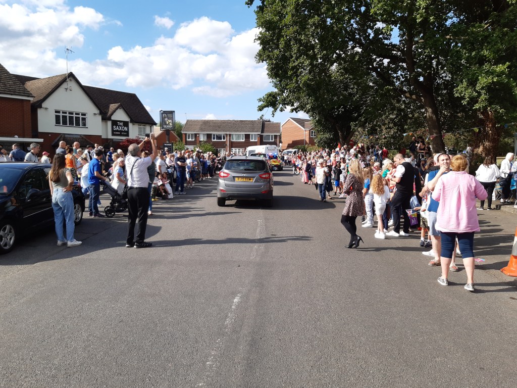 In St John’s Close, the community celebration event from 3-4:15pm included entertainment by the Giant Balloon Show. The baton was scheduled to pass through the village at 3:50pm but was running around 10 minutes late.