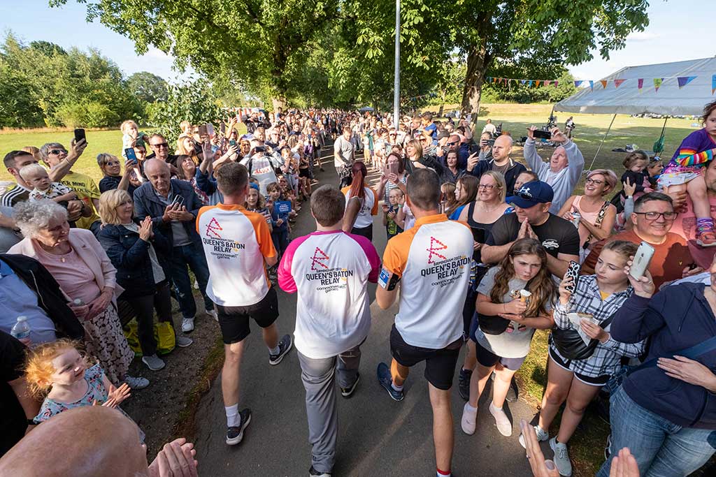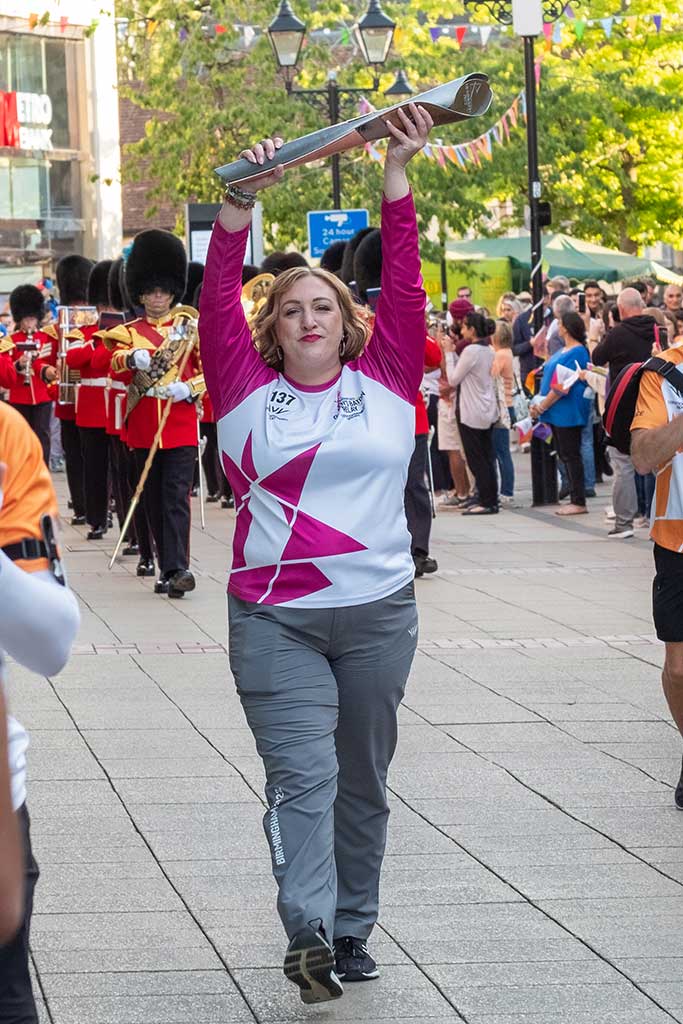 After a more than 40-mile tour of most corners of the borough, Solihull’s leg of the Queen’s Baton Relay (QBR) finished just over 12 hours later at Golden Jubilee Gardens in Solihull Town Centre. The day’s final Batonbearer, Andrew Lucas (BB140), carried the baton from the temporary stage shortly after 8pm, following an unforgettable performance by the Band of the Grenadier Guards.