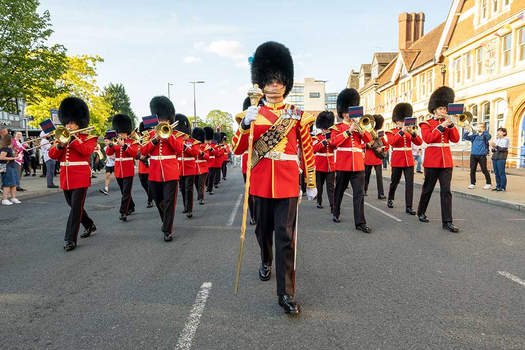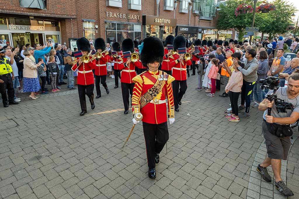 The baton was escorted onto the stage by the Band of the Grenadier Guards, who played a short set of popular tunes, finishing with a rousing rendition of the National Anthem. This was one of the final times that the National Anthem was publicly performed in Solihull with the words “God Save the Queen” being sung. Just over six weeks later, “God Save the King” was sung in Solihull High Street following the Accession Proclamation of King Charles III on Sunday 11th September 2022.