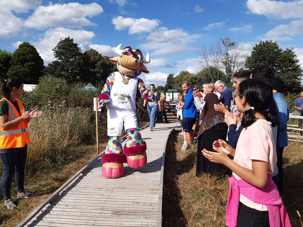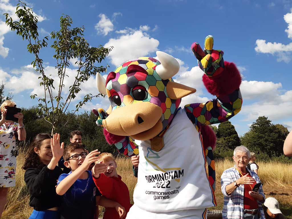 For the baton relay celebrations, tiny trees were given away during the Hope Coppice event, which started at 4pm. The baton itself was scheduled to arrive at 5:20pm but was running about 40 minutes late by this point. Stilt-walkers Treemendous helped to entertain the crowds whilst B2022 mascot, Perry, also made an appearance.