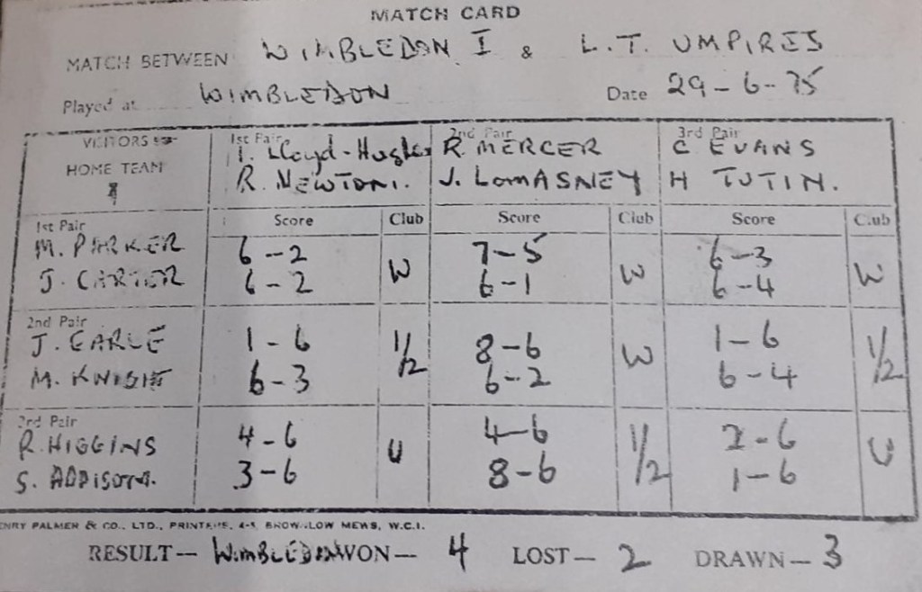 Jim Lomasney officiated as a net-cord judge at Wimbledon in 1975 during the men’s final between Jimmy Connors and Ken Rosewall. Before appearing as a judge that year, he, and other lawn tennis judges played a Wimbledon officials’ team (see match card below).