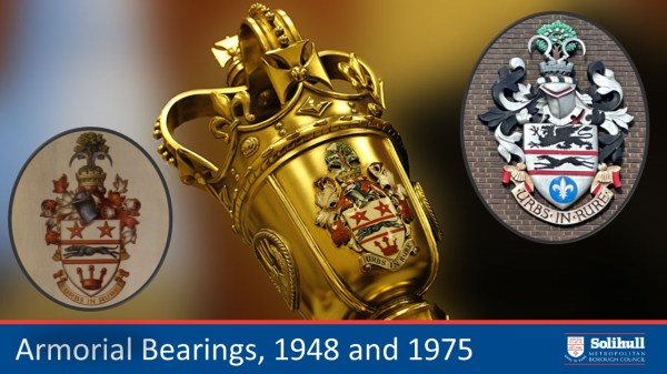The present Armorial Bearings of the Metropolitan Borough of Solihull were granted on 10th December 1975 from a design created by Miss Brenda C. Hands (1931-2016), who worked in the Council’s Technical Services Department. The new Arms replaced the previous Armorial Bearings granted to the then Solihull Urban District in 1948, which were also used by Solihull Municipal Borough and Solihull County Borough.